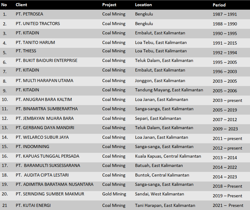 PT. RCI telah mempunyai pengalaman dibidang Kontraktor Pertambangan lebih dari 31 tahun, bermula dari Rental Alat Berat dan berkembang menjadi Kontraktor Pertambangan. PT. RCI juga sudah banyak berhasil dalam menyelesaikan proyek pertambangan dan hingga saat ini telah mengerjakan 22 perusahaan pemilik konsesi penambangan.